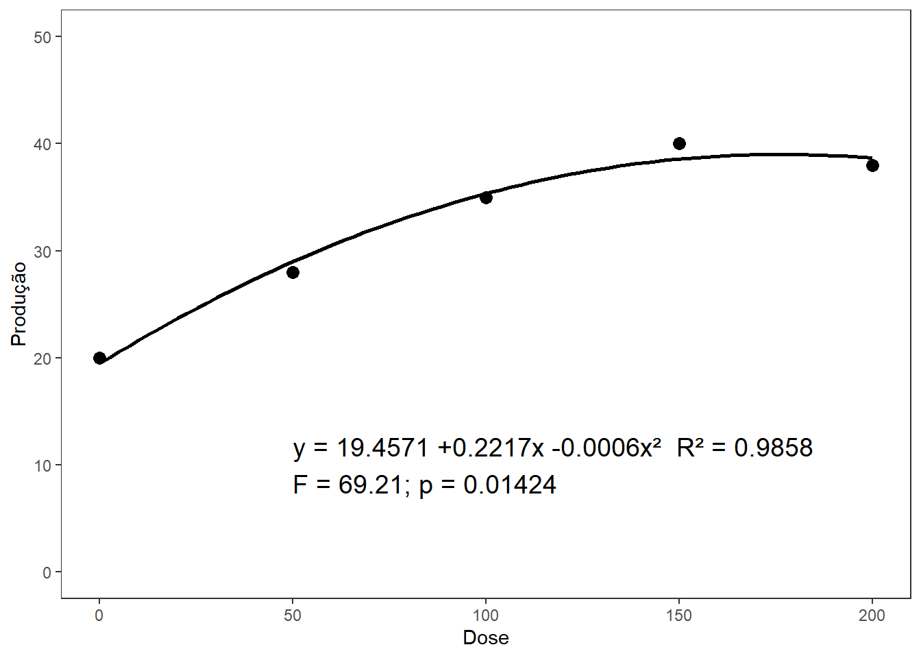 # Coeficientes da regressão quadrática (com mais casas decimais)coef_quad <-coef(modelo_quad)intercepto <-formatC(coef_quad[1], format ="f", digits =4)linear <-formatC(coef_quad[2], format ="f", digits =4, flag ="+")quadratico <-formatC(coef_quad[3], format ="f", digits =4, flag ="+") # usei 6 casas para o termo quadrático porque geralmente é bem pequeno# Estatísticas do modelor2 <-round(a$r.squared, 4)f_value <- a$fstatistic[1]df1 <- a$fstatistic[2]df2 <- a$fstatistic[3]p_value_anova <-pf(f_value, df1, df2, lower.tail =FALSE)# Equação para legendaequacao <-paste0("y = ", intercepto, " ", linear, "x ", quadratico, "x²")legenda <-paste0( equacao," R² = ", r2,"\nF = ", round(f_value, 2),"; p = ", format.pval(p_value_anova, digits =4, eps =0.001))# Gráficolibrary(ggplot2)regressao_quad <-ggplot(dados_reg, aes(x = dose, y = prod)) +geom_point(size =3) +stat_smooth(method ="lm",formula = y ~ x +I(x^2),se =FALSE,color ="black" ) +annotate("text", x =50, y =10, label = legenda, hjust =0, size =5) +labs(x ="Dose", y ="Produção") +theme_bw() +theme(panel.grid =element_blank()) +ylim(0, 50)# Exibir gráficoregressao_quad